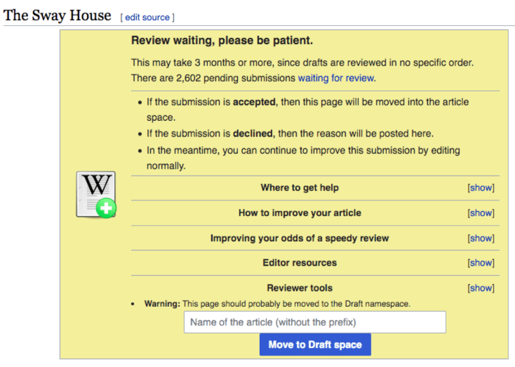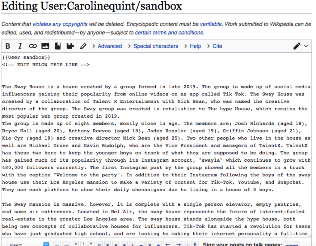 Later that day I found that someone had just made a Wikipedia article on the hype house, so I was no longer able to use this. Then I remembered that I saw on social media that there was a competing group called the sway house. The sway house did not have much publicity therefore making it the new subject of my article. I then decided to submit a proposal through “WP:AFC” which is where you submit articles for creation. You have to get this approved in order to make an article. I then began to write and article by composing the article in something called the sandbox.