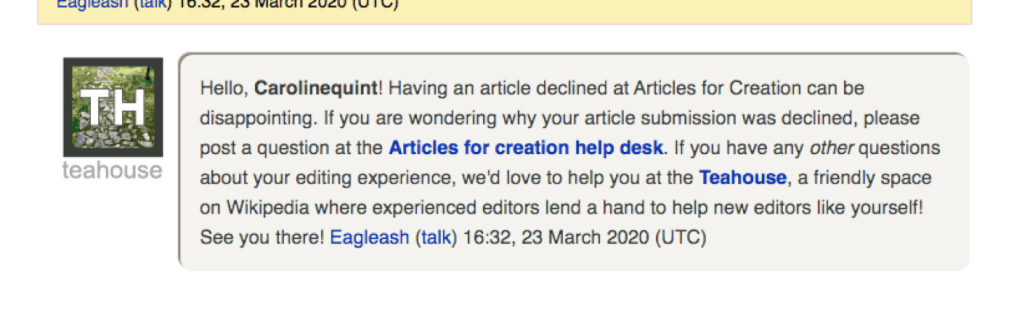 I then had my article declined by reviewing articles for consideration. This makes sense due to the errors I had in connecting my account to the sway house and making it legitimate. I then referenced back to the video that was provided about how to create a Wikipedia article. I followed the steps again and was able to have it approved to be written.
